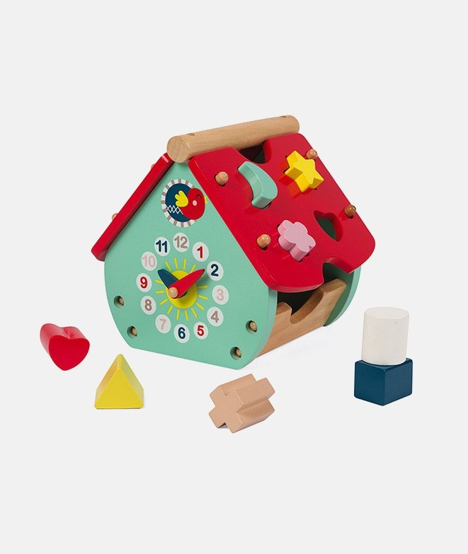 Baby Forest House Shape Sorter de la Janod este un sortator de forme în formă de căsuță, cu piese din lemn viu colorate. Copiii introduc formele geometrice în orificiile corespunzătoare, exersând recunoașterea formelor, coordonarea ochi–mână și motricitatea fină. Designul robust și culorile atractive îl fac ideal pentru micuți.