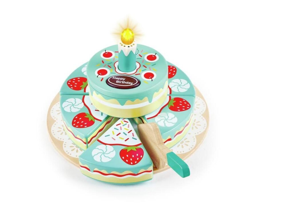 Interactive Happy Birthday Cake de la Hape este un set de joacă pentru sărbători imaginare. Tortul din lemn are lumânări detașabile și accesorii, iar prin apăsarea butonului copiii pot auzi melodii aniversare. Ideal pentru jocuri de rol și dezvoltarea abilităților sociale, îi învață pe copii despre ritualurile sărbătorilor și împărtășirea momentelor speciale.
