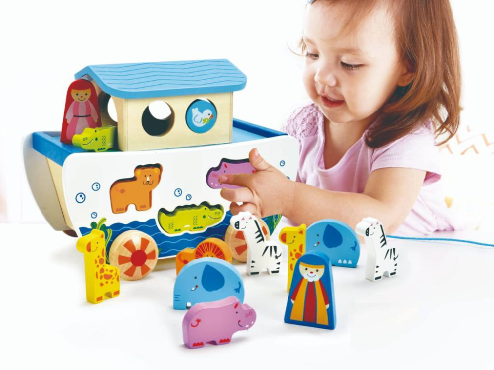 Pull along Noah Ark de la Hape este o arcă din lemn pe roți, cu sfoară de tras, ideală pentru joaca în mișcare. Copiii pot plimba arca prin casă, exersând mersul și coordonarea, apoi pot încărca/descărca animăluțe imaginare pentru joc de rol. Baza stabilă și roțile cu rulare lină mențin interesul, iar lemnul finisat cu vopsele pe bază de apă oferă siguranță sporită.